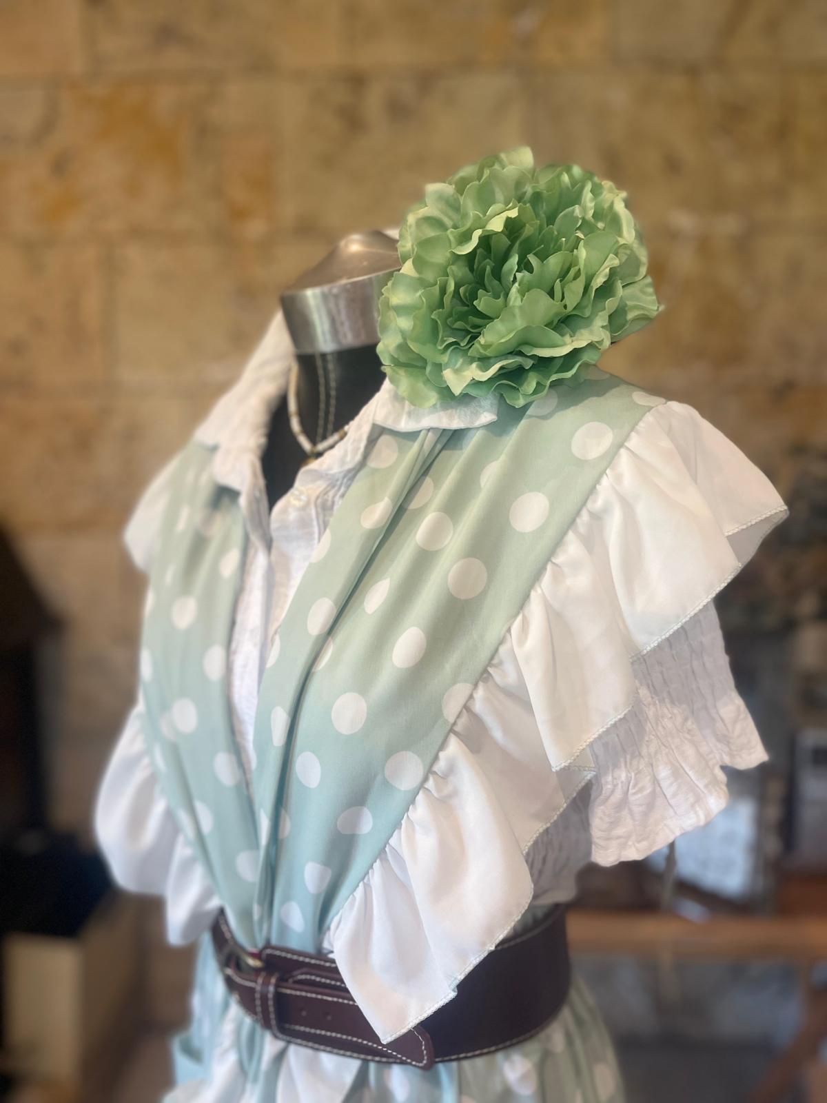 FALDA ROCIERA EN VERDE AGUA LINAR EN BLANCO CON SU PIQUILLO A JUEGO.IDEAL PARA ESOS DIAS DE ROCIO O ROMERIAS !!!!! TEJIDO FRESQUITO Y COMPATIBLE PARA AMAZONA..... UNA MARAVILLA