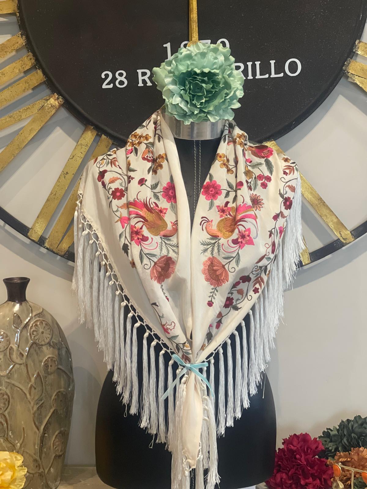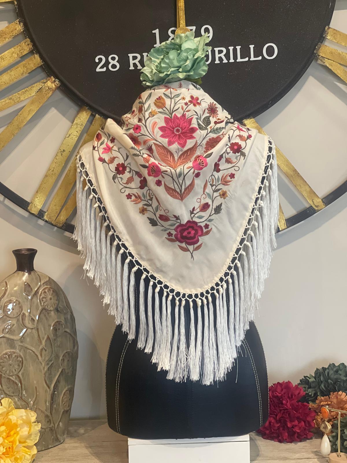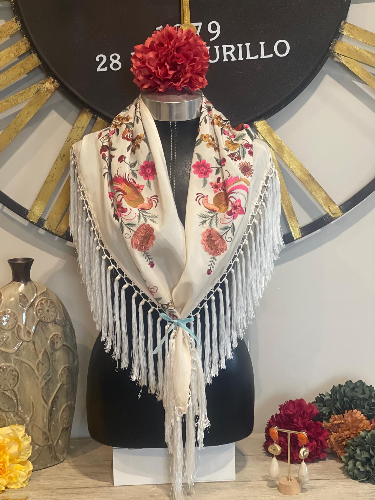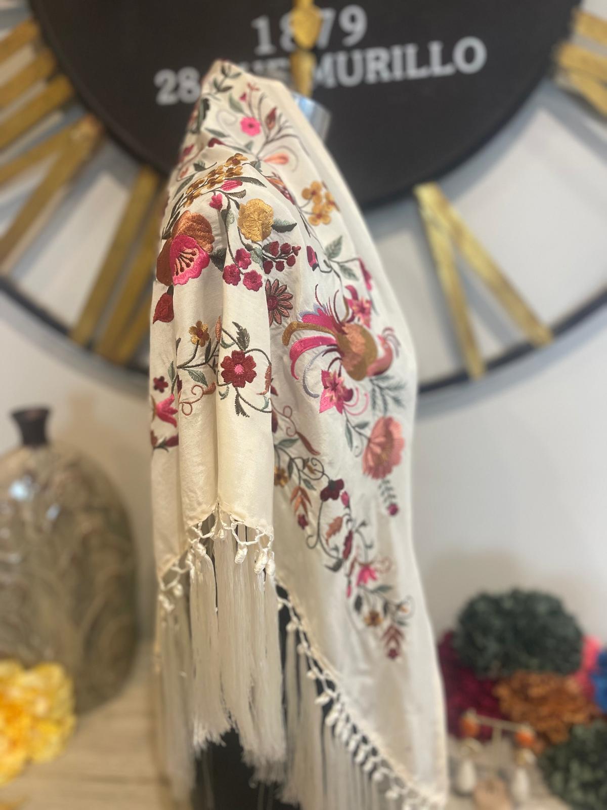 MANTON COLOR BLANCO ROTO EN SEDA ,BORDADOS MOTIVOS FLORALES , ENFLECADO A MANO ,COLOR AL TONO
