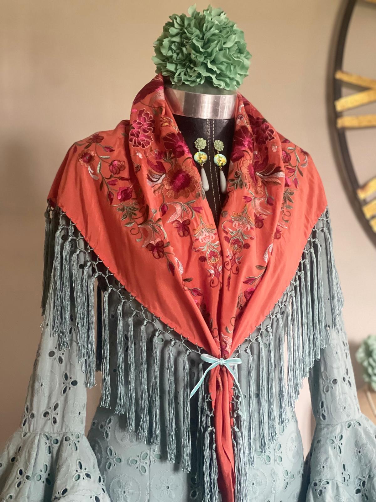 LA COMBINACION DEL COLOR TERRACOTA Y EL FLECO EN VERDE EMPOLVADO HACE MAS ESPECIAL Y ORIGINAL EL MANTON.