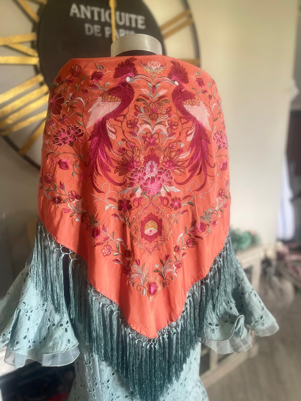 MANTON COLECCION PAJAROS, COLOR TERRACOTA ,CON BORDADOS VIBRANTES .