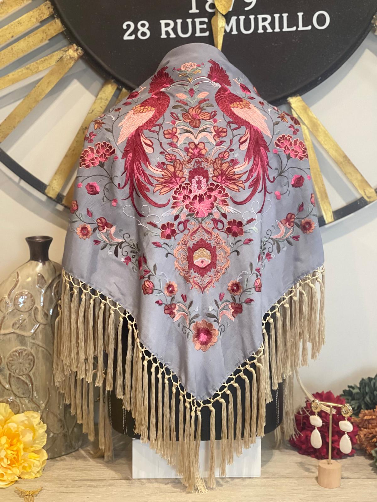 MANTON DE GITANA COLOR GRIS AZULADO CON BORADADOS VIBRANTES Y FLECOS EN TONOS TOSTADOS.