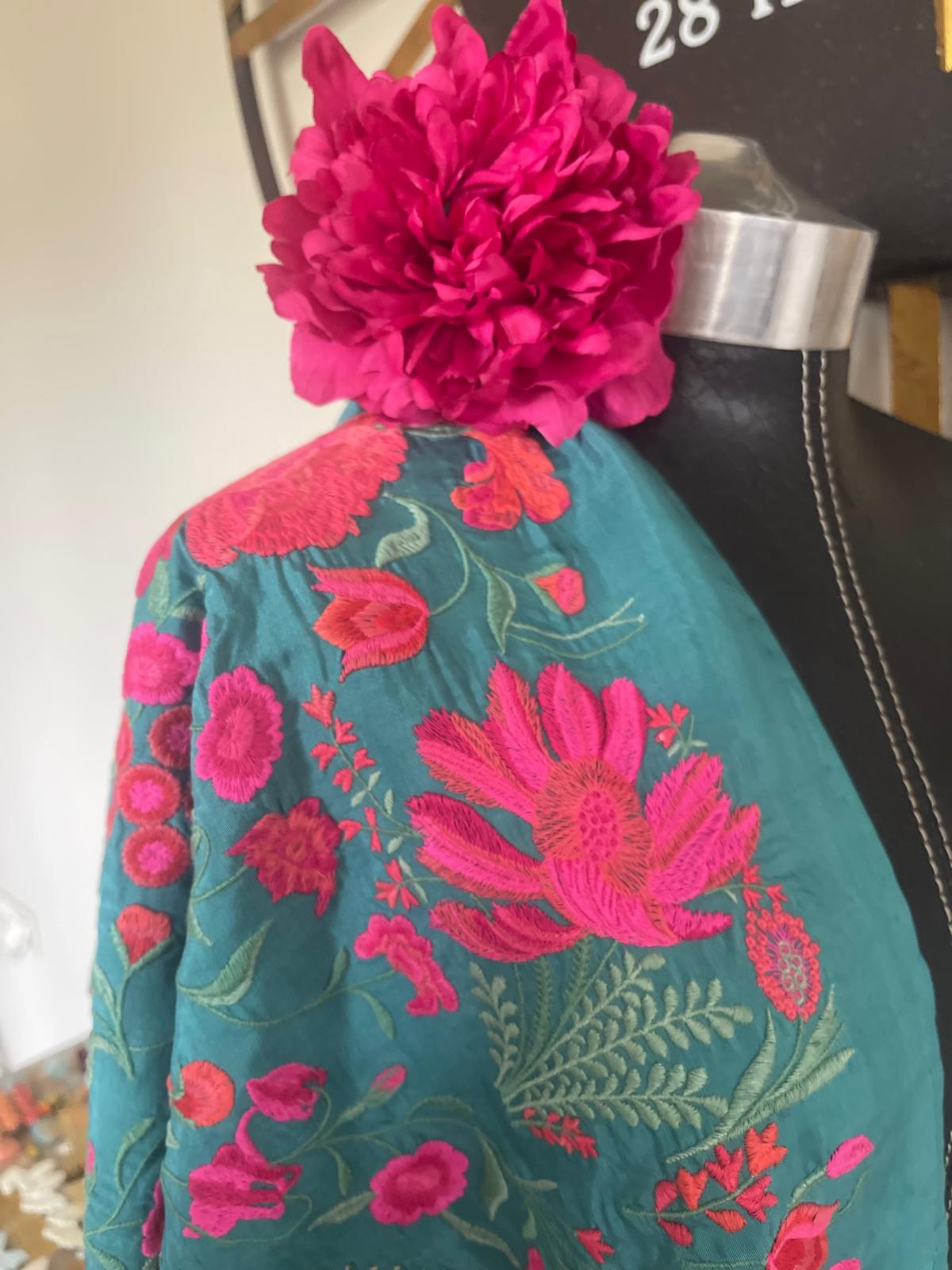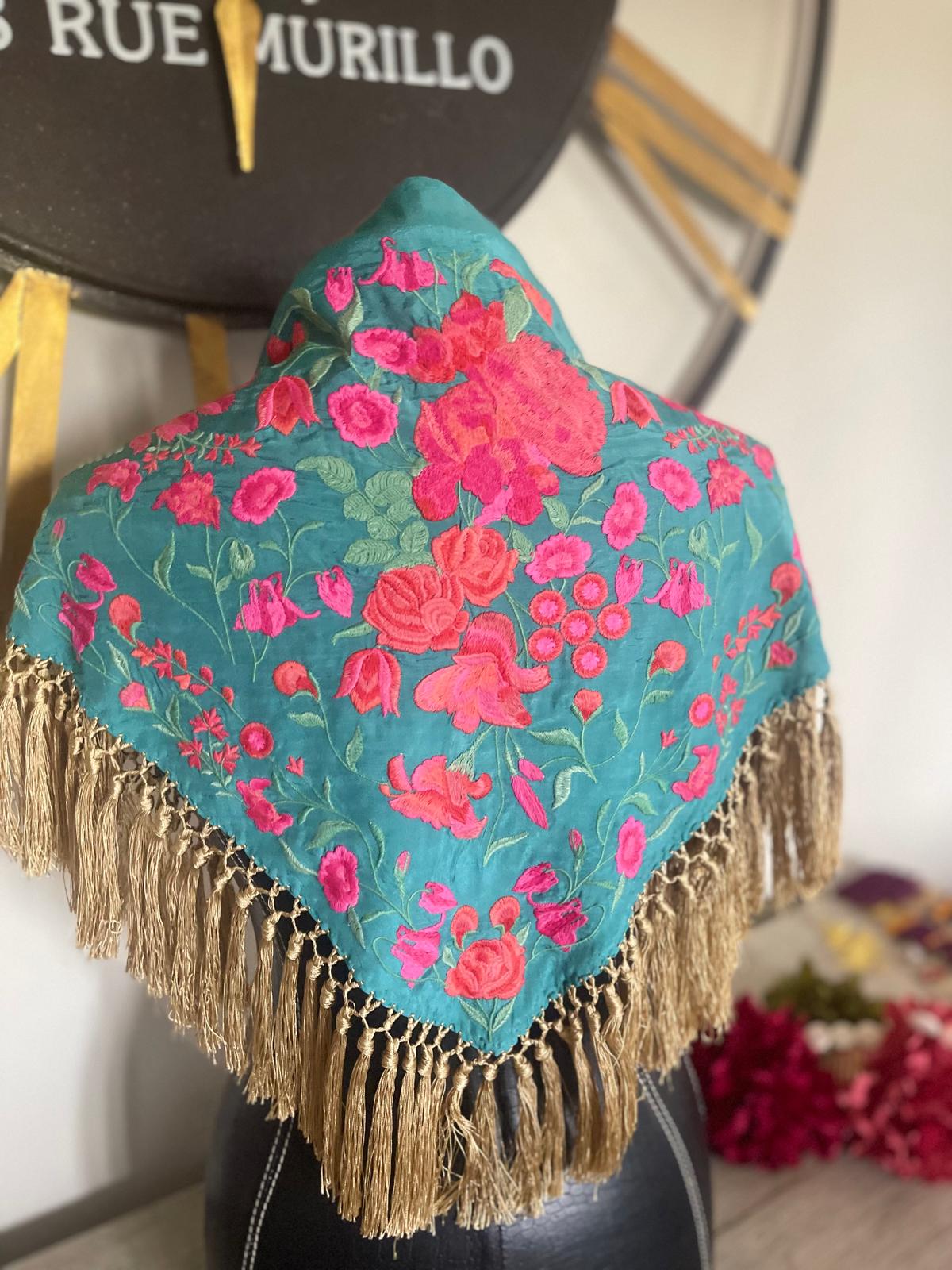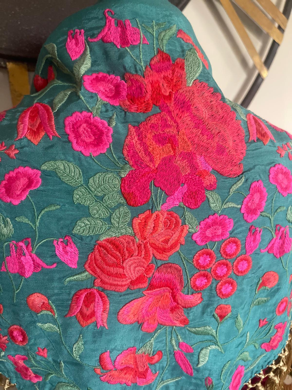 Un mantoncillo seda con enflecado a mano color vibrante ,bordado motivo floral