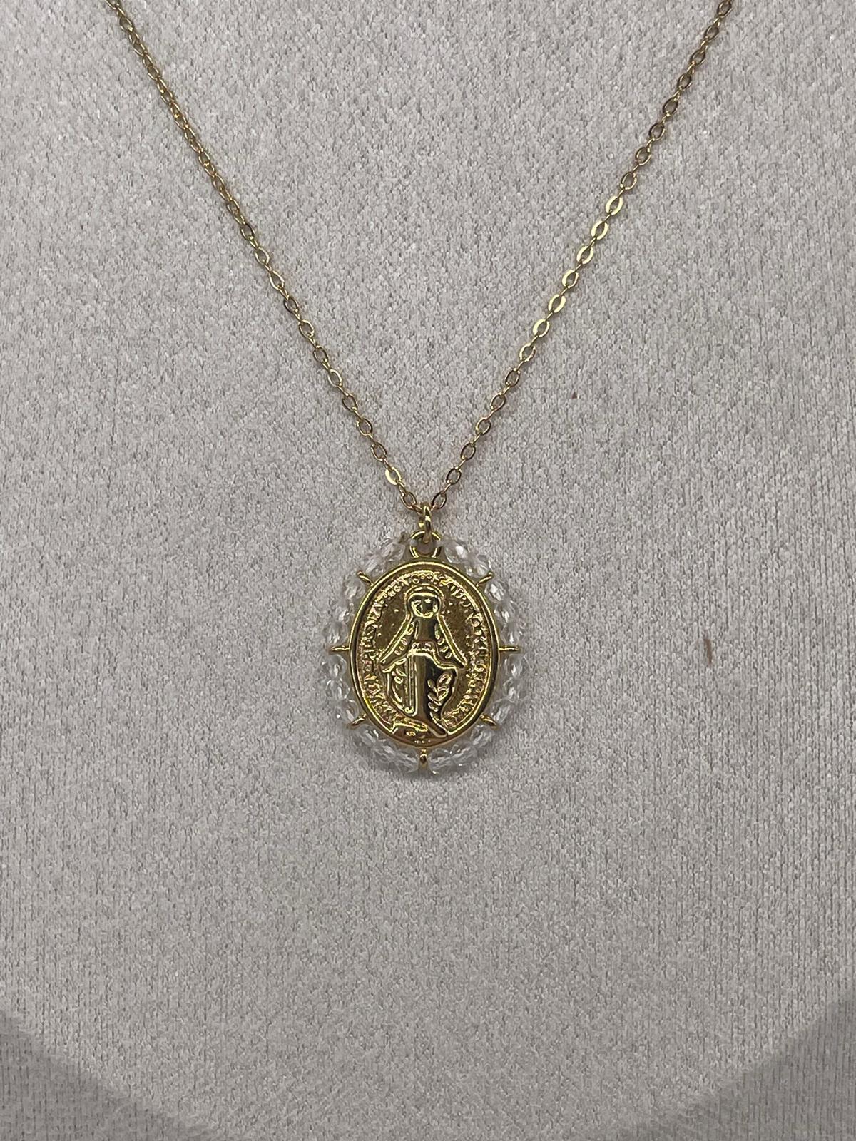 Medalla dorada en acero bordeada en perlitas blancas.