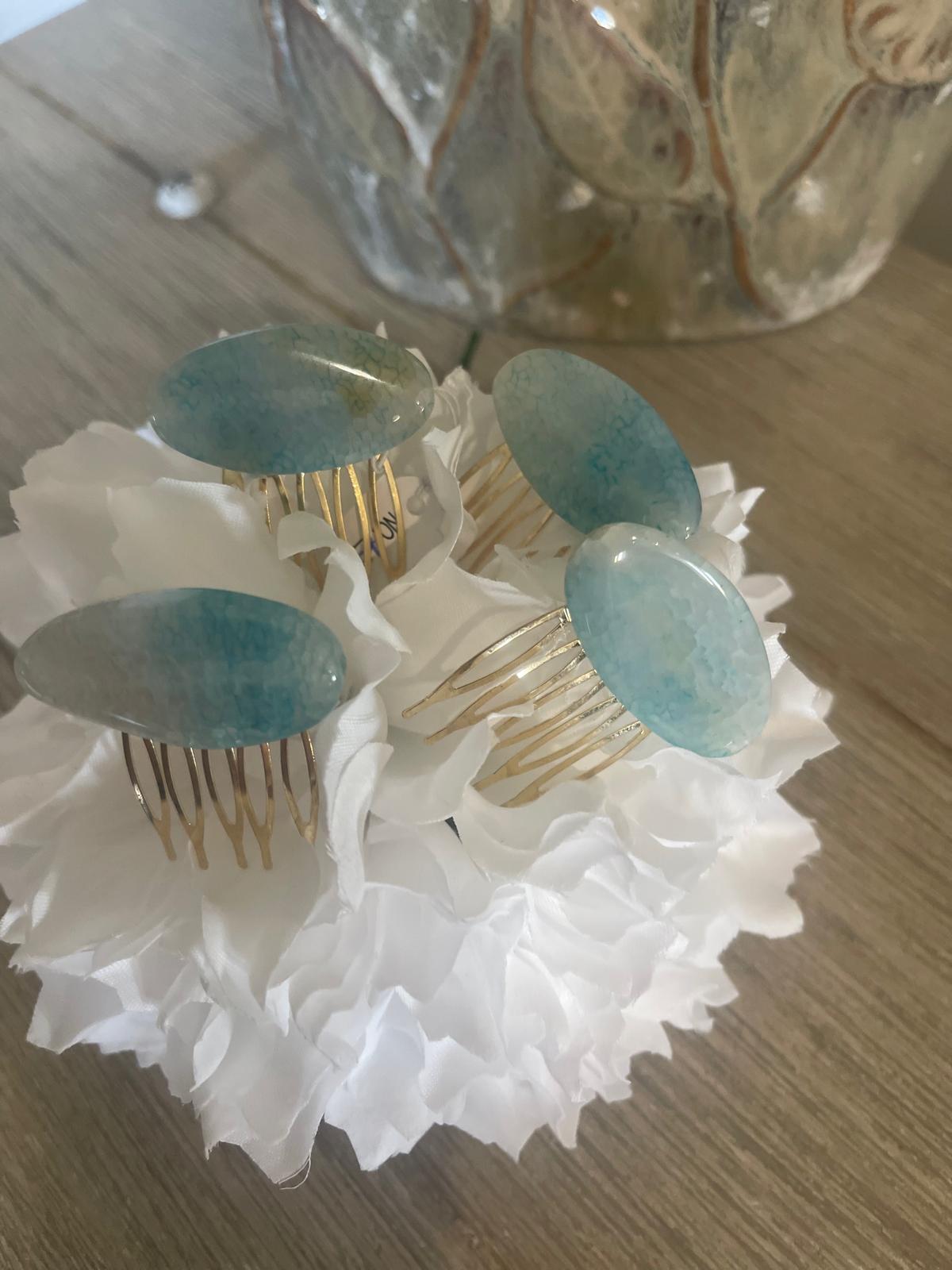 PEINAS DE PIEDRA NATURAL EN UN TONO AZUL NO TODAS EXACTAMENTE IGUALES AL TONO AL SER NATURALES. IDEAL PARA COMBINARLAS Y RESALZAR TU LOOK.